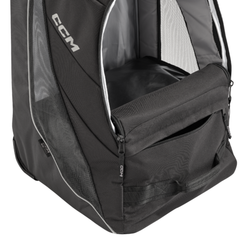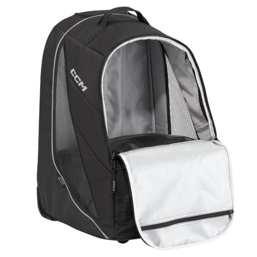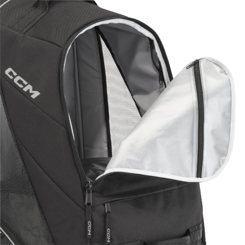 Plecak hokejowy na kółkach to idealne rozwiązanie dla zawodników w ciągłym ruchu. Wyposażony w wytrzymałe, terenowe kółka oraz wysuwany uchwyt teleskopowy, gwarantuje łatwy i wygodny transport sprzętu. Dodatkowe kieszenie na łyżwy, praktyczna kieszeń na mokre rzeczy oraz specjalny rękaw na kij zapewniają porządek i bezpieczeństwo Twojego ekwipunku. Wykonany z wysokogatunkowego poliestru o wysokiej gęstości z powłoką PVC i wykończony odblaskową lamówką wokół logo CCM, plecak łączy w sobie trwałość, funkcjonalność i nowoczesny design – gotowy na każdy trening i mecz.